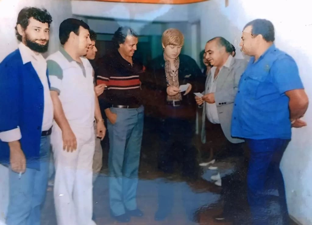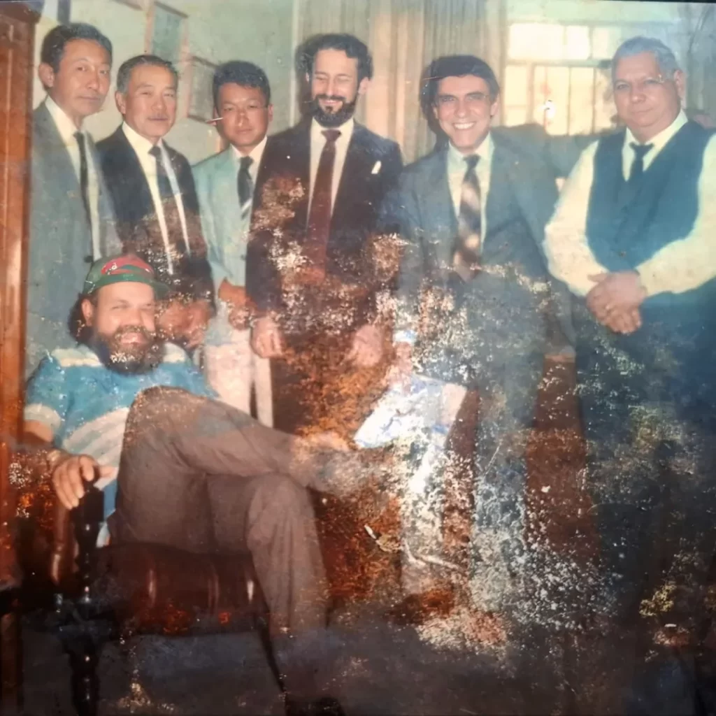 Integrantes do Conseg do 32 DP de Itaquera reunidos no escritório da Rohe Administração de Bens. Neste dia, em outubro de 1986, eles foram para uma audiência no Palácio do Governo do Estado de Sāo Paulo. Na imagem estāo o presidente José Romero, o vice Amaury Roldan Pereira e os membros Sidehome Nakamura, Toshio Katsuno, Yamaguchi, Cláudio Domingues Leal Maia e Carlos Alberto.