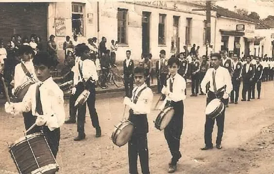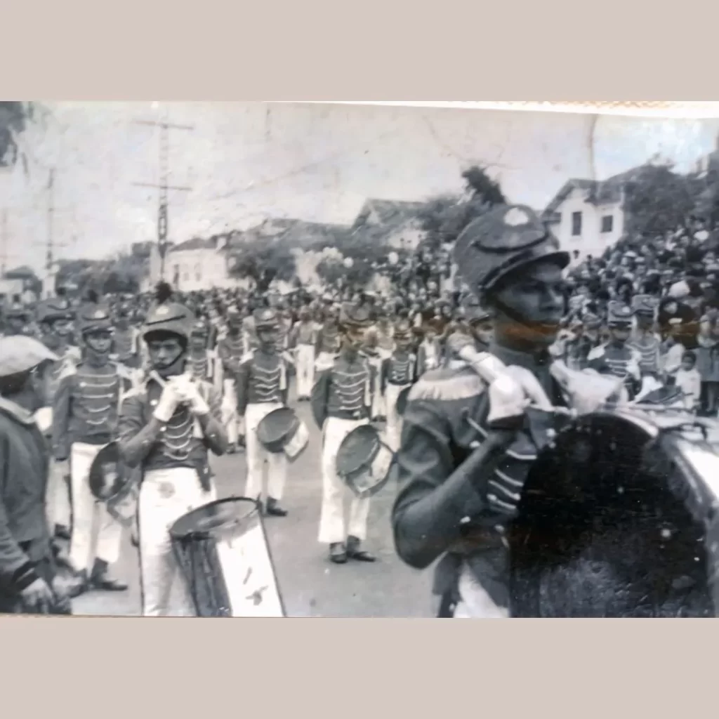 Na rua Gregório Ramalho a fanfarra da Escola Estadual Emilia de Paiva Meira desfilando em meio as comemoraçoes do Sete de Setembro, Independência do Brasil. Detalhe: Gregório Ramalho ainda de terra.