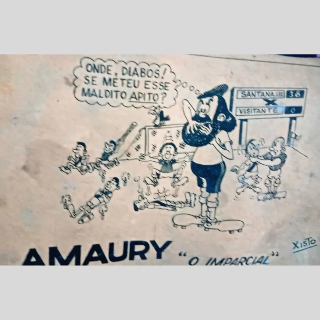 Em seu traço, Xisto mostra Amaury como juiz de um jogo do Santana e com elástico placar ao fundo.
