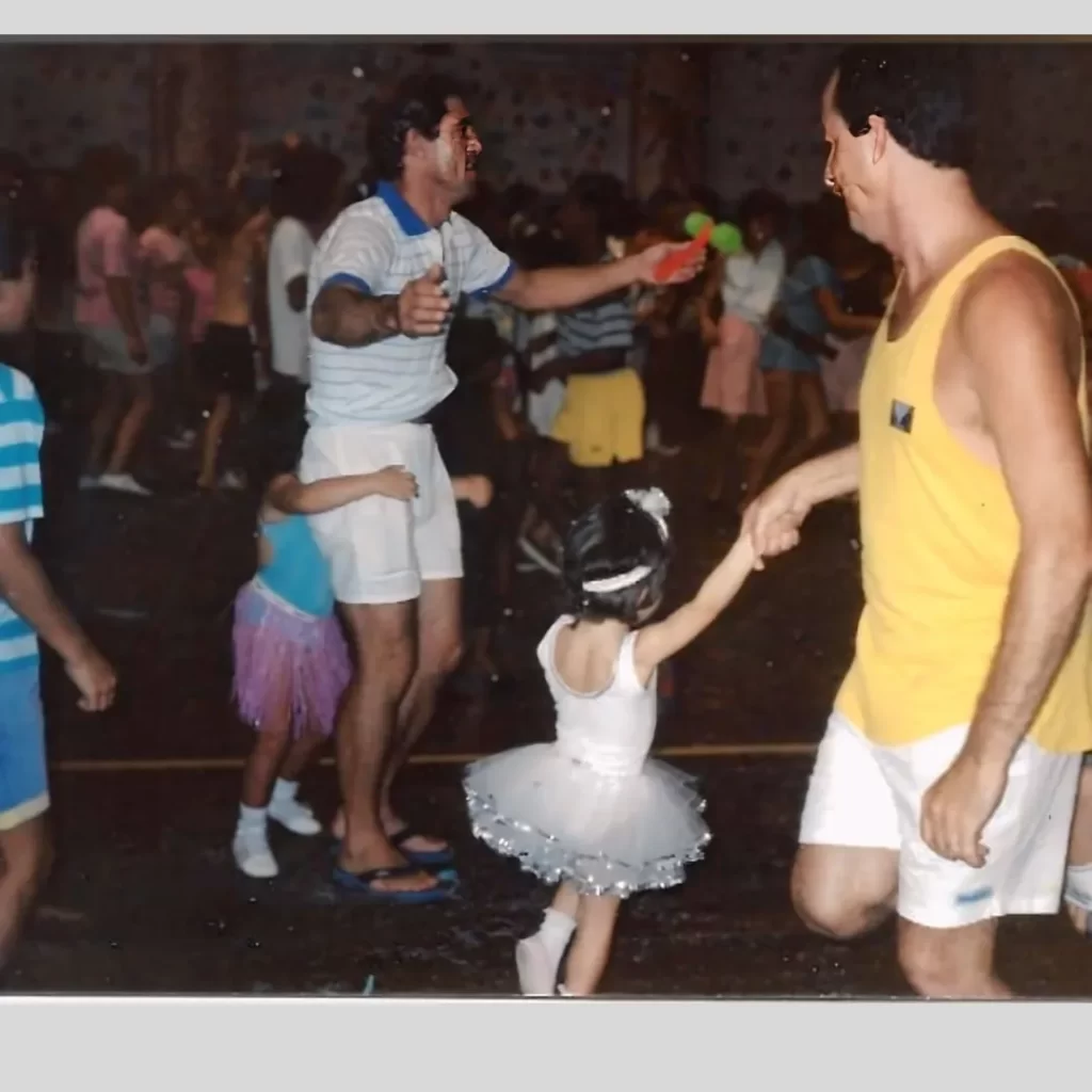 Matinê de Carnaval no Elite Itaquerense em 1987. Na imagem está o historiador Marcos Falcon com a filha Beatriz e o contabilista Roberto Davanzo “Berola” com a sobrinha.