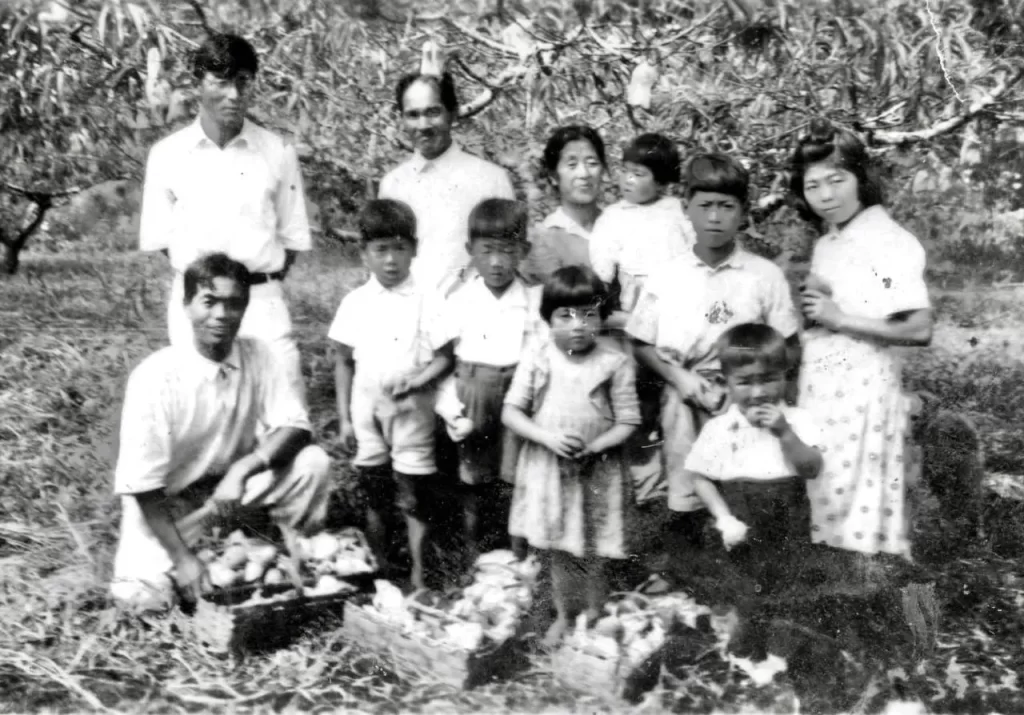 Com 100 anos recém completados a Colônia Japonesa em Itaquera faz parte da história do bairro, tanto na cultura do pêssego, de flores e de plantas ornamentais e, também, como opção para o passeio de domingo com a família. Neste registro está Hisaji Morita, a esposa Kessako, filhos e amigos na colheita de pêssegos na Colônia. A imagem é da década de 50.