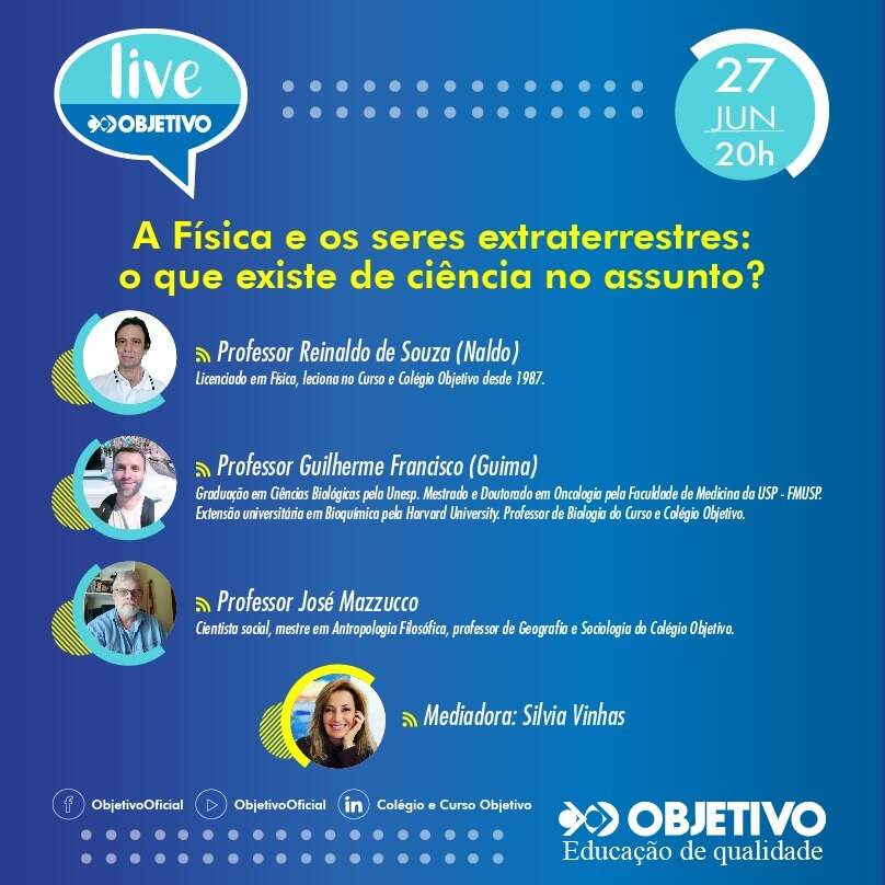 Mediada pela jornalista Silvia Vinhas, a apresentação trará três grandes mestres das salas de aula do Objetivo nas áreas da Física, Biologia e Filosofia: em Física, o Prof. Reinaldo de Souza (Naldo), em Biologia, o Prof. Guilherme Francisco (Guima) e, em Filosofia e Sociologia, o Prof. José Mazzucco travarão um bate-papo descontraído sobre o que há de ciência quando o assunto é vida extraterrena.