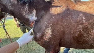 O pedido de resgate partiu do próprio DPPC, que acompanhou toda a operação no local. Segundo informações levantadas durante a ação, o cavalo apresentava diversas feridas pelo corpo – semelhantes a queimaduras – além de sinais de desnutrição, como costelas aparentes e lesões no pescoço compatíveis com uso de cordas.