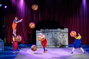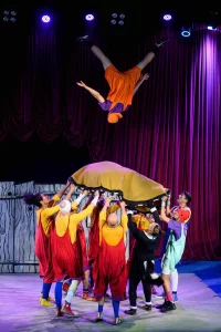 Inspirado em desenhos animados e sem o uso de falas, o espetáculo “Esquadrão Bombelhaço” abusa da comicidade física, além de performances com malabarismos, manipulação de objetos e acrobacias aéreas no equipamento “pizza”.