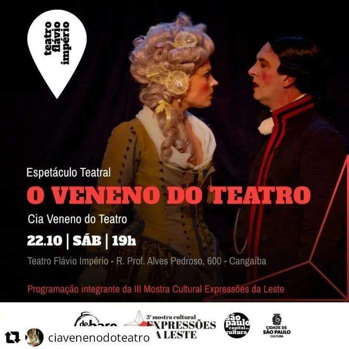 19h – Espetáculo teatral O Veneno do Teatro, com Cia Veneno do Teatro – Local: Teatro Flávio Império, R. Prof. Alves Pedroso, 600 – Cangaíba