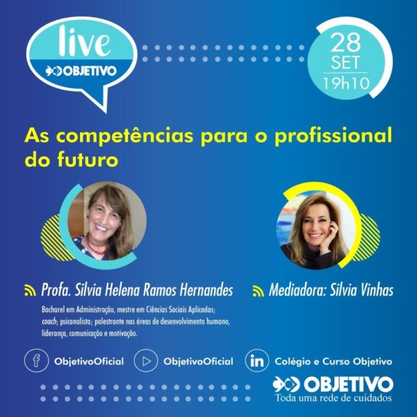 No próximo dia 28 de setembro, às 19h10, em parceria com a Universidade Paulista – UNIP, as redes sociais oficiais do Objetivo transmitem a live “As competências para o profissional do futuro”.