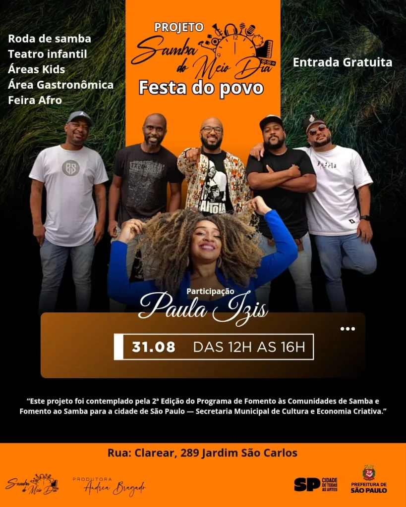Nesta edição, a atração musical de destaque é a cantora Paula Izis, com sua voz marcante e balanço inconfundível entre samba e samba-rock. Sua participação promete contagiar o público e reafirmar o samba como expressão de resistência e identidade.